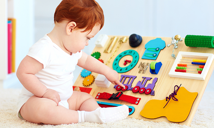 • この時期の子どもはドアのチェーンやレバーなど、基本的に自分で動かせるもので遊ぶのが大好きです。手や指先を動かすことのできる知的玩具で遊ばせてあげましょう。