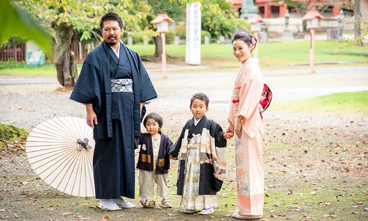 5歳男児: 「袴着」の儀式が由来なので、紋付の羽織袴が基本です。羽織には武者、鷹、兜などの絵柄が、袴には縞柄の仙台平などが一般的です。また、扇子を身に着け、足元は白足袋に草履(雪駄)をはきます。
